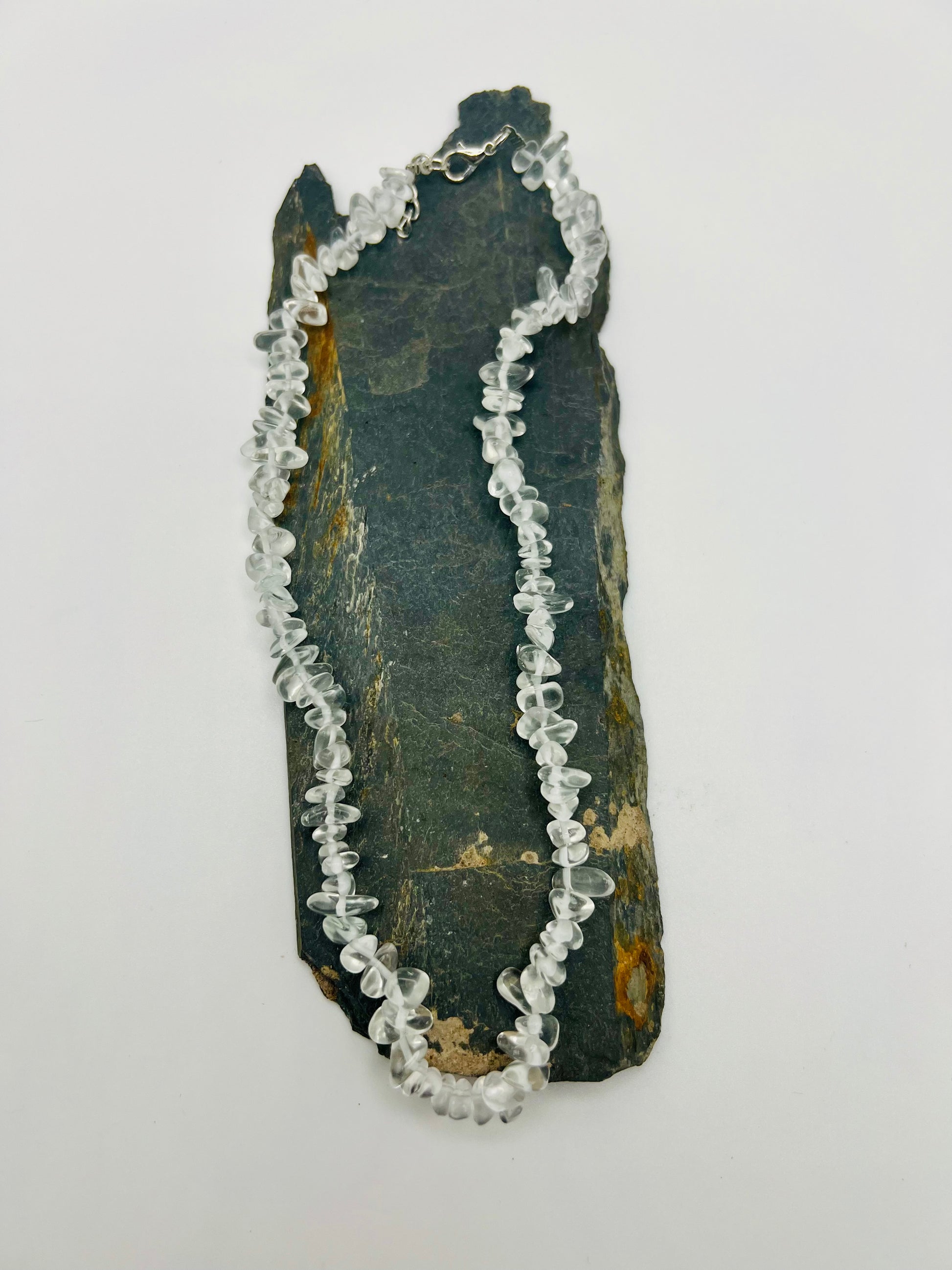 Clear quartz is revered in crystal healing traditions for its purifying and amplifying properties. This necklace features genuine quartz chips suspended on a chain, making it an accessible way to carry the stone's energy throughout your day. The natural variation in each chip ensures your piece is entirely unique. Ideal for those exploring crystal wellness or seeking a subtle, elegant accessory that bridges spirituality and everyday style.