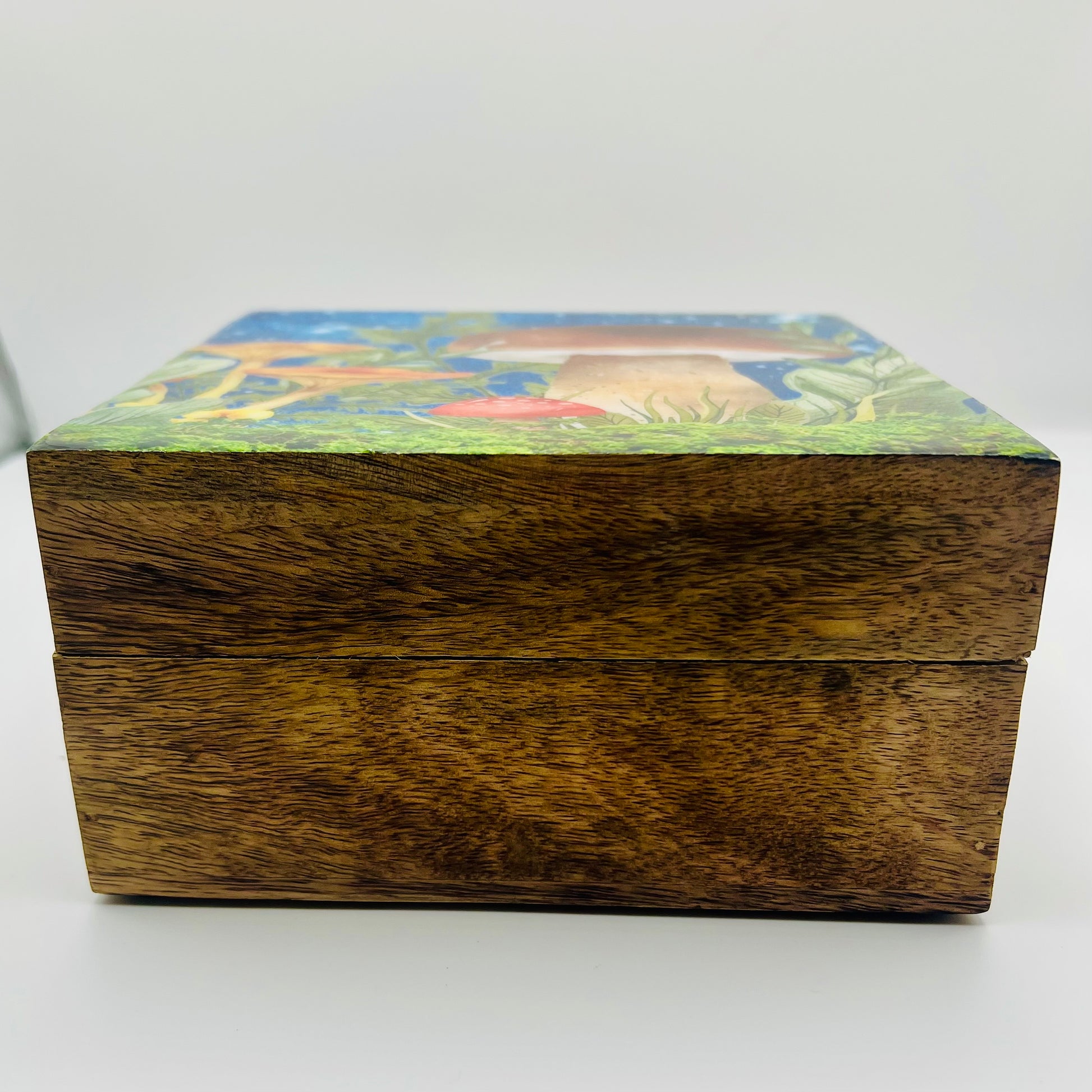 This is a handcrafted mango wood square box with a teal mushroom design.