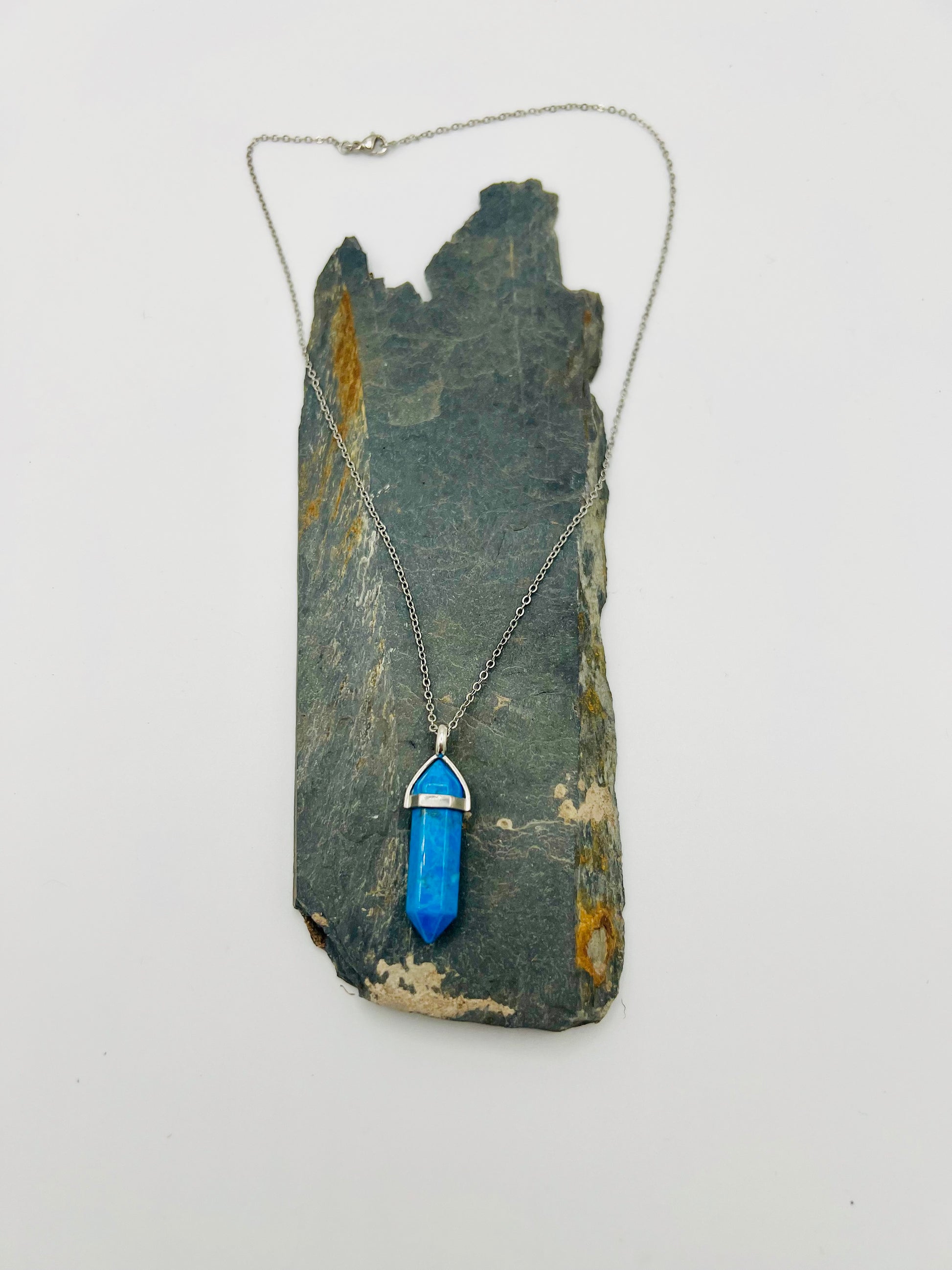 This striking pendant necklace features a carefully selected blue howlite stone, expertly cut into a distinctive pointed form that catches light beautifully. Blue howlite is traditionally valued for its calming properties and serene aesthetic, making it an ideal choice for those seeking meaningful jewellery with natural appeal. The pointed design adds contemporary sophistication to the classic pendant style, while the stone's natural veining creates a unique pattern on each piece. Perfect for layering or wearing as a standalone statement, this necklace combines geological beauty with thoughtful craftsmanship.