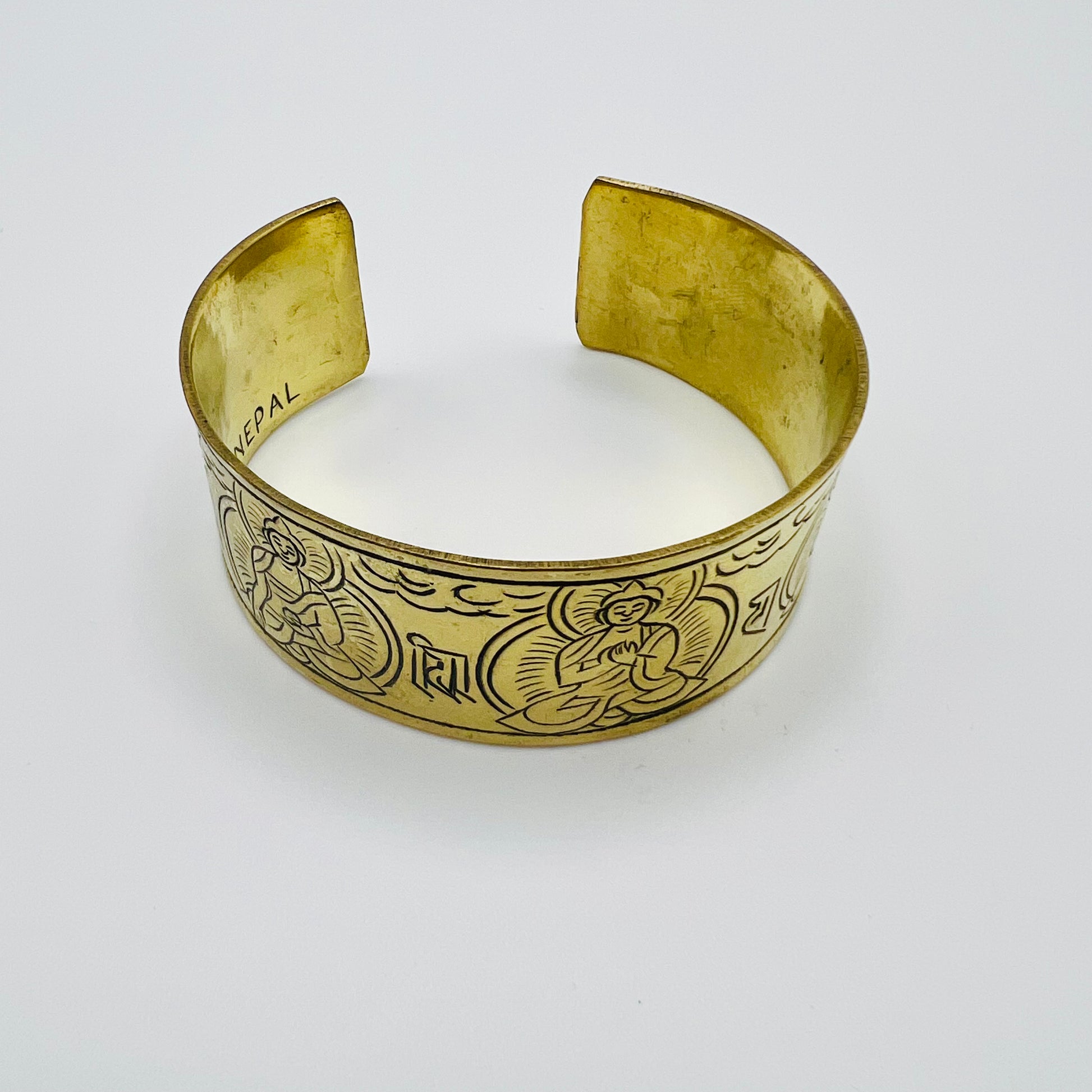 Handcrafted brass Tibetan mantra cuff bracelet made in Nepal.
